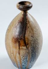 Elegant ovoid vase in stoneware with a narrow neck, featuring a nuanced glaze in subtle shades of beige, brown, blue, and orange. The flowing glaze, both controlled and spontaneous, evokes the movement of molten material, giving the piece an organic and vibrant presence. The slightly textured surface and chromatic transitions reflect the mastery of Alexandre Bigot, a leading ceramic artist of the Art Nouveau period.