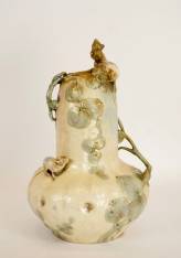 The lustrous glaze displays a subtle harmony of beige, grey-green, and mauve tones, giving the piece a soft, luminous texture characteristic of Amphora productions around 1900.