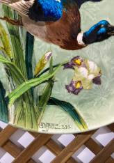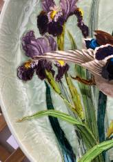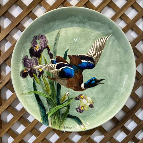 Large enamelled earthenware platter, produced circa 1900 by Émile Difflloth in collaboration with Boch Frères, La Louvière. Polychrome decoration with gilt highlights depicting a mallard in flight among irises, set against a pale green relief-moulded background.