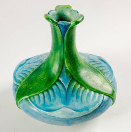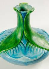 An elegant stoneware vase with a stylized vegetal motif, characteristic of the Art Nouveau style. The refined shades of blue and green, ranging from turquoise to emerald, highlight the fluid lines of the form and lend the piece a poetic harmony typical of Edmond Lachenal’s work.