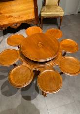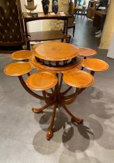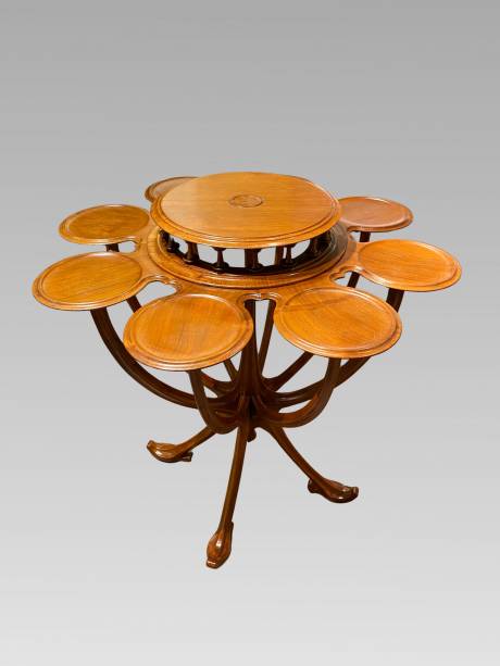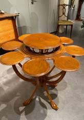 The circular top rests above an ingenious composition of eight smaller platforms arranged in a radiating circle. These peripheral trays, delicately integrated into an openwork gallery of turned spindles, create a harmonious visual rhythm while serving a convivial function—ideal for presenting and sharing tea with both practicality and refinement.