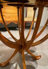 The base, a true feat of cabinetmaking, unfolds into fluted, gracefully curved legs that rise with lightness before branching into an elegant network of interlacing forms. This airy, almost vegetal structure reflects the influence of Art Nouveau, where line becomes movement and form evokes nature.
