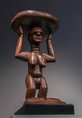 The heaviness of the chest with its conical breasts, the quality of the numerous lozenge scarifications, the strength of the lower limbs strongly attached to the base and the large crushed feet which merge with the socket, give this work a very morphological conception. The geometry of the long arms, which fit into the empty space of the table in a symbolic gesture that also conveys its vitality and strength, contributes to the elegance that emanates from this sculpture. An important study in African art.