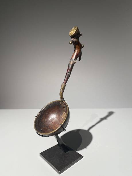 Made from half-shells of small coconuts, with brass encircling the bowl, and the handle crafted from bamboo with brass inlay on the protruding parts. The top of the handle also features a stylized orchid flower in brass, an emblematic flower of Indochina.
