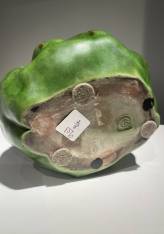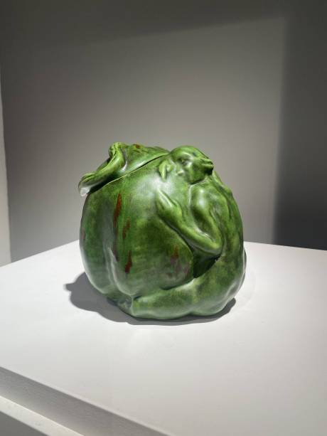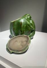 The deep green glaze, subtly enhanced with reddish-brown runs, reinforces the living, tactile quality of the composition, while the supple modelling of the volumes attests to the artist’s sculptural mastery. The female body appears to merge with the vegetal form in a poetic metamorphosis, in which the utilitarian function of the object gives way to a symbolic and decorative vision characteristic of Carabin’s work.
