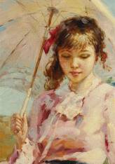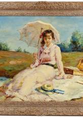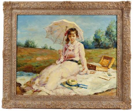 La composition se distingue par une palette lumineuse et des touches de pinceau souples, qui traduisent la douceur de l’atmosphère et la fraîcheur du décor naturel. Le traitement sensible du visage et des étoffes, ainsi que la spontanéité de la matière picturale, confèrent à l’ensemble un charme intimiste et poétique.