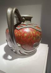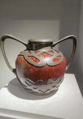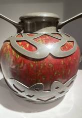 L’œuvre est sublimée par une importante monture en étain finement travaillée, composée de deux grandes anses latérales aux lignes souples et élégamment mouvementées. Cette monture ajourée se distingue par un décor raffiné d’entrelacs, déployé en frise sur les parties haute et basse du vase, témoignant d’une sensibilité décorative proche de l’Art nouveau. Elle est attribuée à des créateurs majeurs de cette période, tels que Maurice Dufrène ou Édouard Colonna.